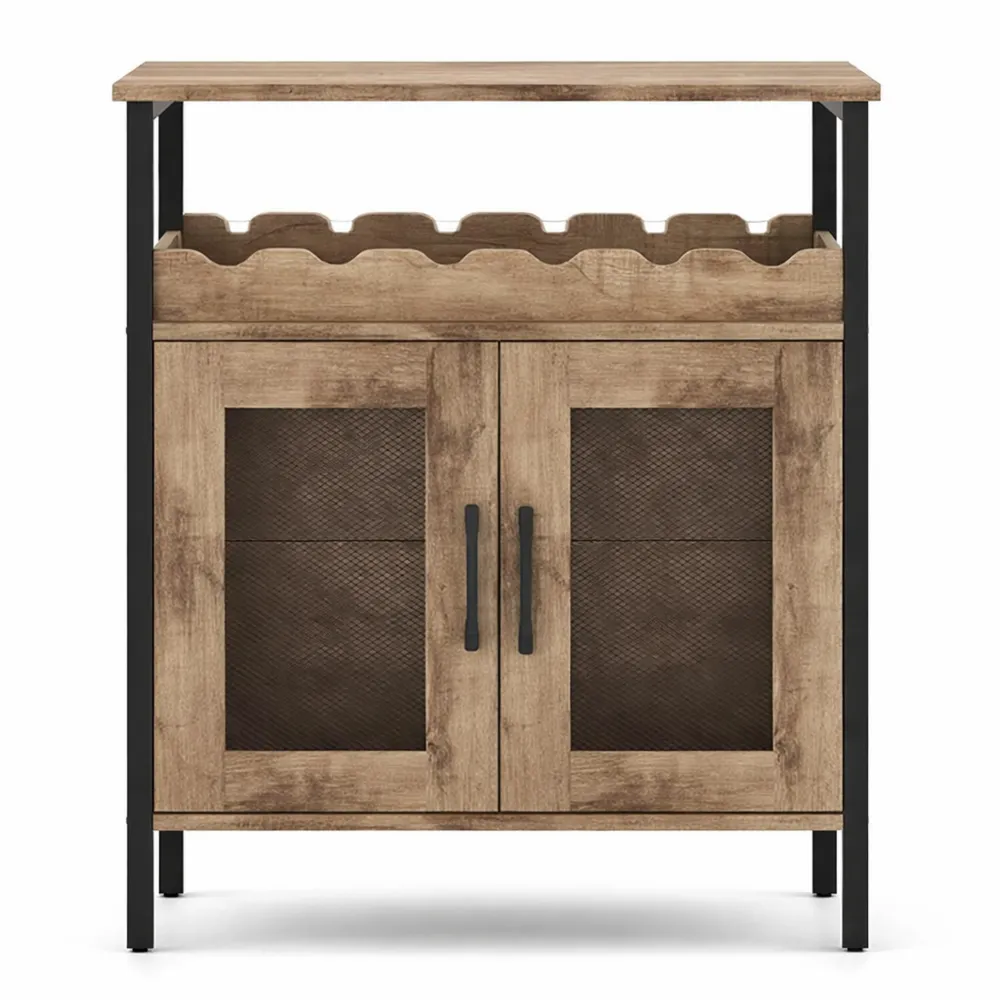 Questo mobile è dotato di un portabottiglie rimovibile per 5 bottiglie e porta bicchieri per 6 calici. Costruito con pannelli in legno e struttura in metallo, offre stabilità grazie ai piedini regolabili e accessori antiribaltamento. È versatile per diverse occasioni, utilizzabile come mobile bar o contenitore.